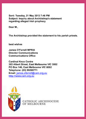 Arcibiskup v Austrálii považovaný za jeden z najsilnejších, arcibiskup Denis J. Hart of Melbourne, vydal nasledujúce vyhlásenie o údajnej prorokyni prezývajúc sa: Mária Božieho milosrdenstva a so sídlom v Írsku. Oficiálny list zaslaný všetkým Melbourne farnostiach uvádza: